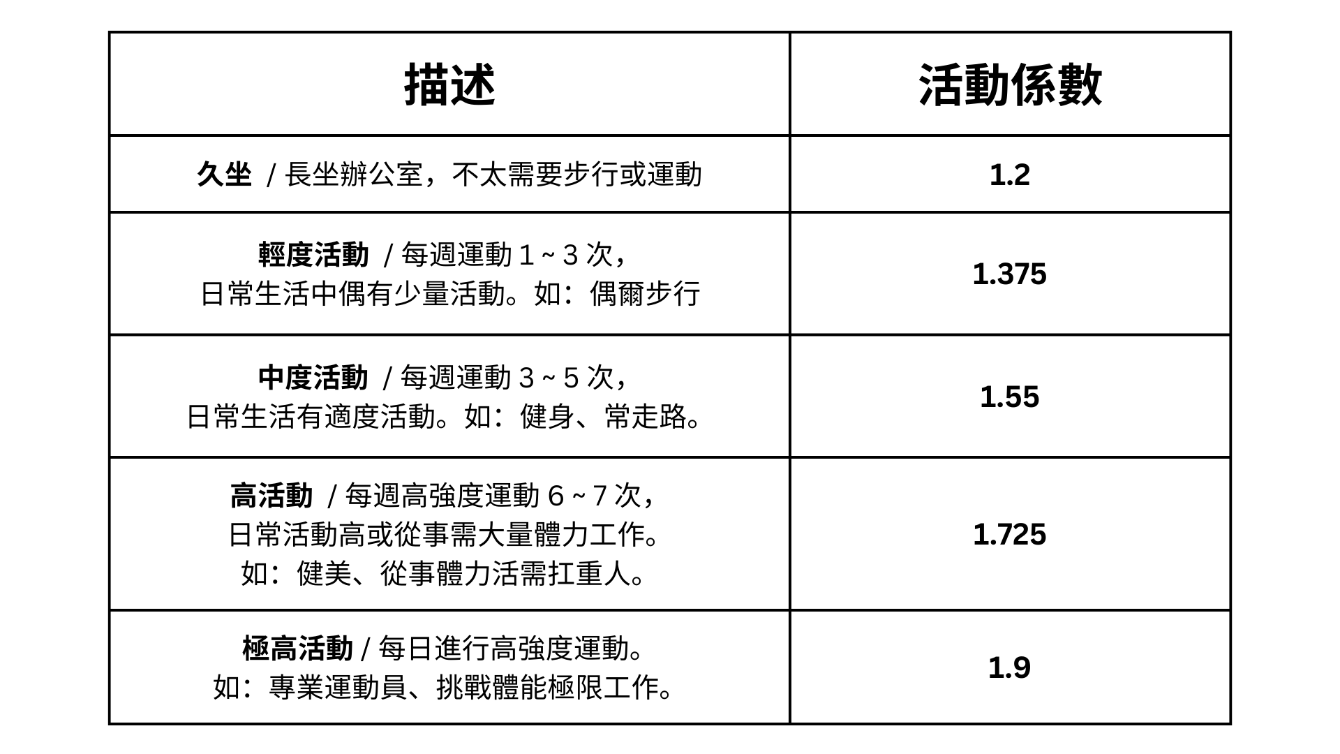 關於活動係數,大致上可以區分成五種,基本上普通人介於 1.2 ~ 1.725 之間,從坐辦公室,到需要一整天不斷扛重物等,將活動量區分,因此每個人的 TDEE 會根據原本計算出來的 BMR 有非常大的一段落差,大家可以照自己的生活模式簡單判斷一下並用下面的計算機來計算!