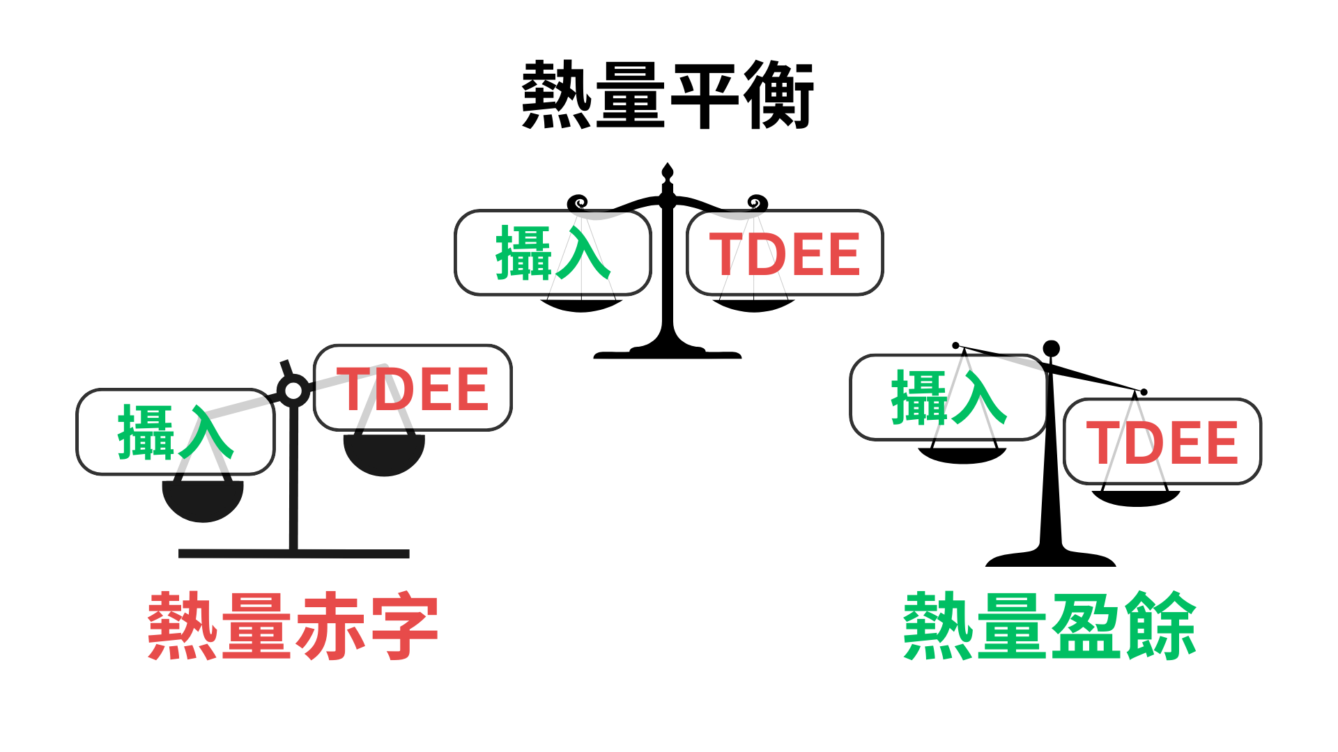 當吃得跟消耗一樣多時,這時體重不會有太大的變化,會有些水分排除等等,這時是熱量平衡;而當吃的比消耗的多,這時則是熱量盈餘,多餘的卡路里會讓體重上升;最後,當吃的比消耗的少,這時則是熱量赤字,要維持身體運行,則會消耗儲存於身體的能量,讓體重下降。