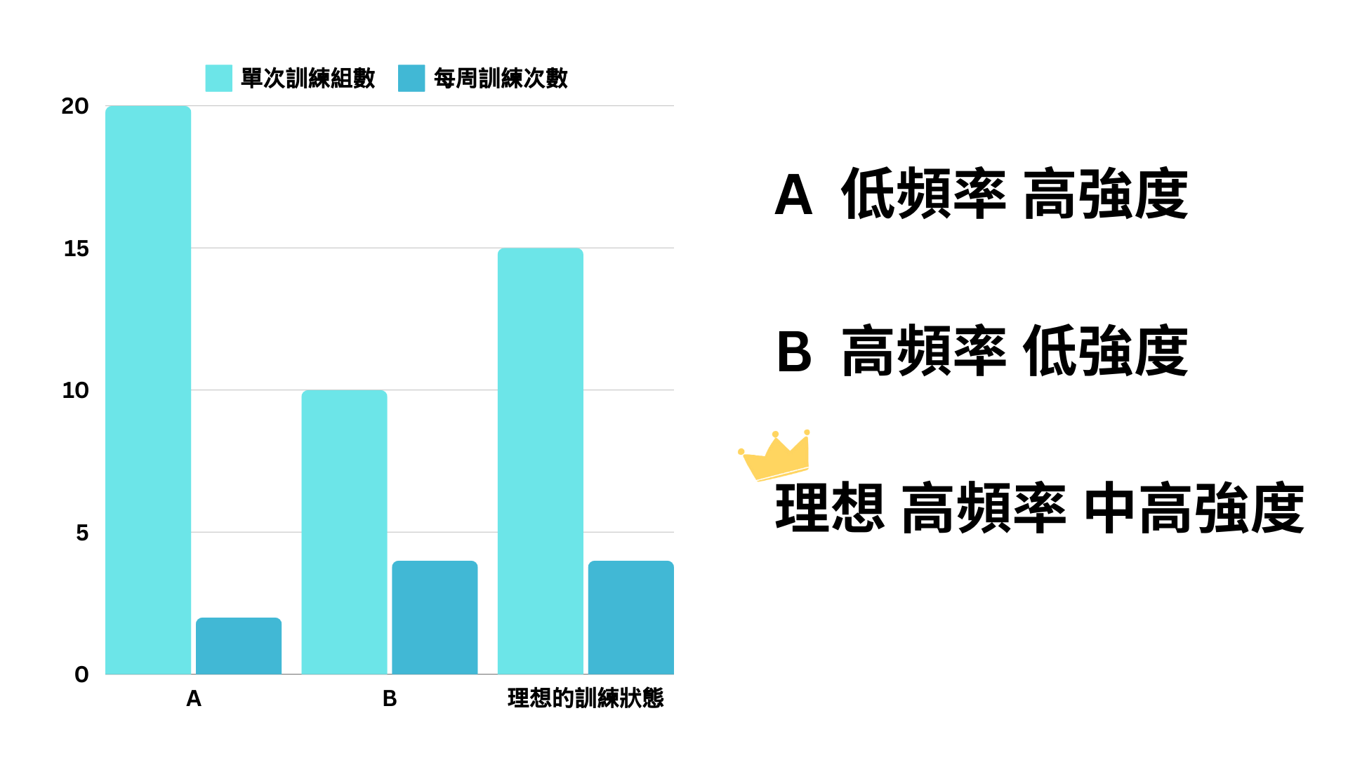 理想的情況會是像 B 維持 4 練的頻率,將每次訓練組數稍微微調到 12 - 15 組,一周的訓練組數可以達到 48 - 60 組,多了 1.2 ~ 1.5 倍的訓練量,不會做到像 A 這麼多,還能夠提高訓練量。 (組數及頻率皆為參考,訓練的方式因人而異)